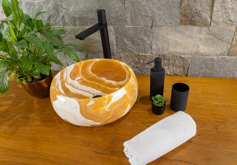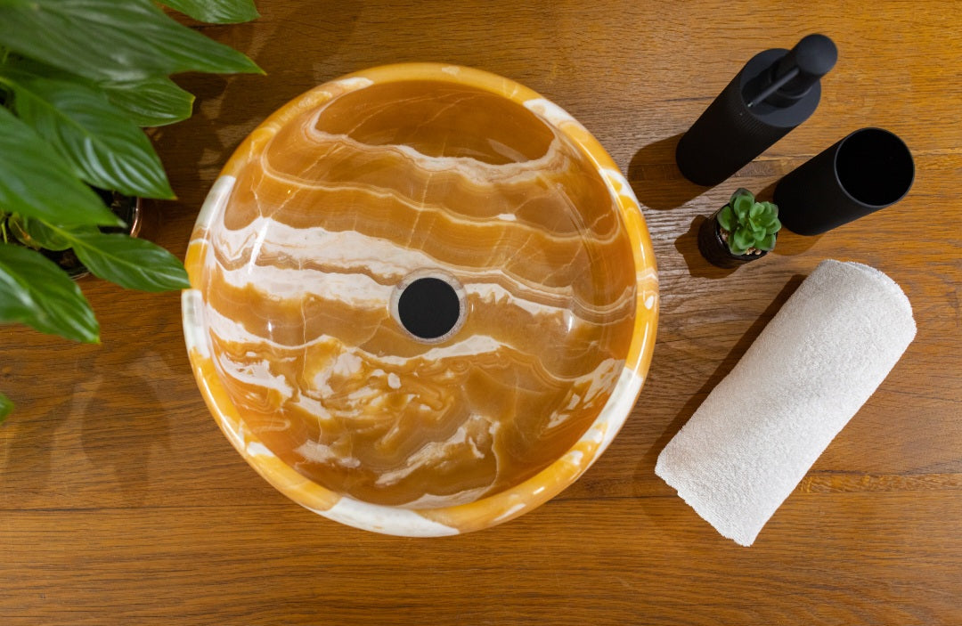 Unikatni umivaonik od prirodnog kamena oniks prečnika 40cm.