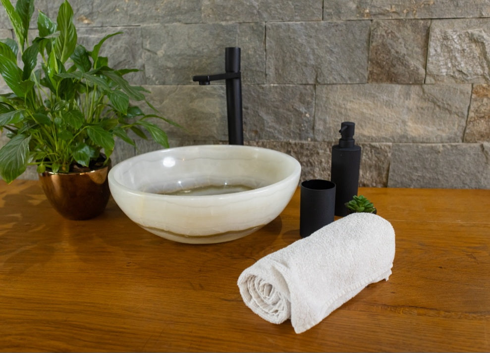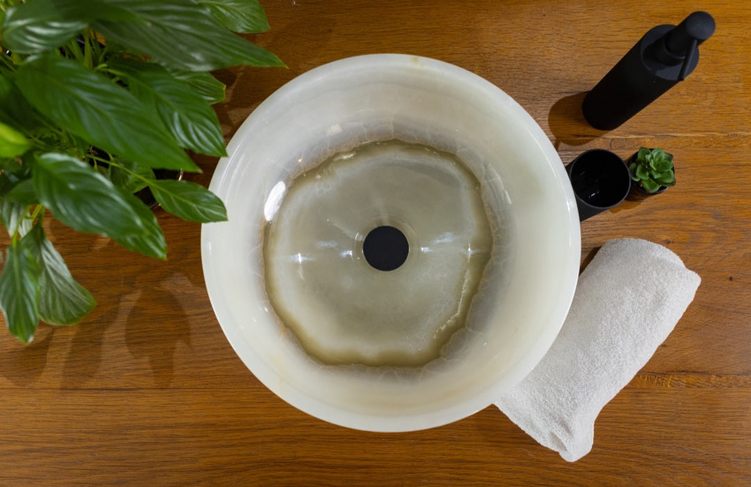 Unikatni umivaonik od prirodnog kamena oniks prečnika 40cm.